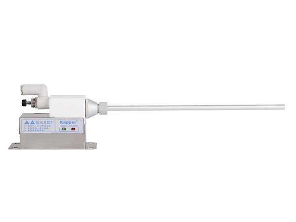 兩個噴嘴正好位于即將進入裝填站之前的位置。一個噴嘴朝向容器外側(cè),另一個朝向容器內(nèi)側(cè)。環(huán)形棒位于填裝頭所在高度附近,分配管道末端也位于該處。這樣,就消除了容器壁的粉末吸附,以及粉末在填裝頭上的堆積??蛇x用KP2001A強風(fēng)力離子風(fēng)嘴